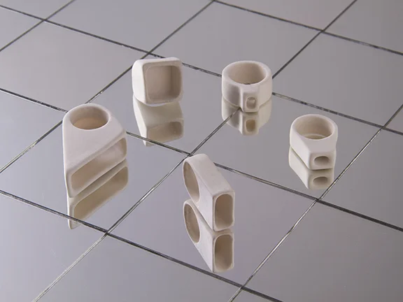 a jewelry study in geometric forms. cast porcelain high-fired with no glaze.